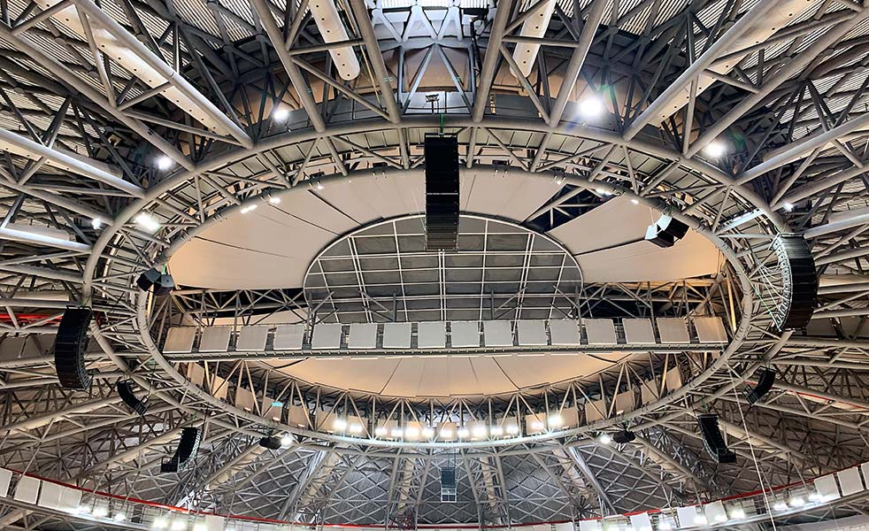 音響系統(tǒng)選用84只LAX AT208兩分頻雙8″陣列音箱,根據(jù)揚(yáng)聲器吊掛高度以及觀眾席深度,有針對(duì)性的調(diào)整揚(yáng)聲器組的輻射,使得能量精準(zhǔn)覆蓋于觀眾席,不僅保證了整體觀眾席擴(kuò)聲的最大聲壓級(jí),也保證了聲場(chǎng)均勻度。此外,技術(shù)工程師還加入了2個(gè)AT12M作為監(jiān)聽(tīng)。而此套系統(tǒng)由DB07功放驅(qū)動(dòng)。