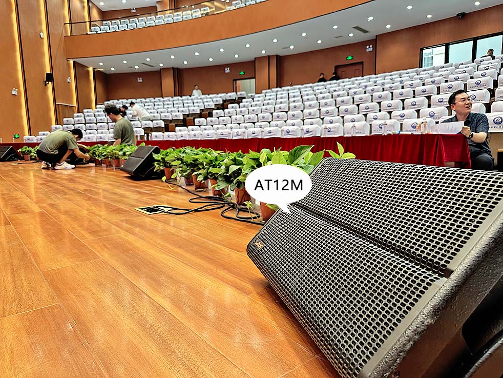 舞臺(tái)臺(tái)口均勻擺放4 只流動(dòng)返送揚(yáng)聲器LAX AT12M,用于舞臺(tái)內(nèi)監(jiān)聽(tīng)。