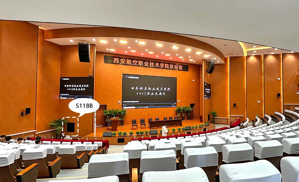 舞臺(tái)兩側(cè)各設(shè)置1只 LAX S118B超低音揚(yáng)聲器,對(duì)擴(kuò)聲系統(tǒng)低音部分進(jìn)行補(bǔ)償。