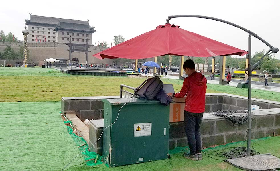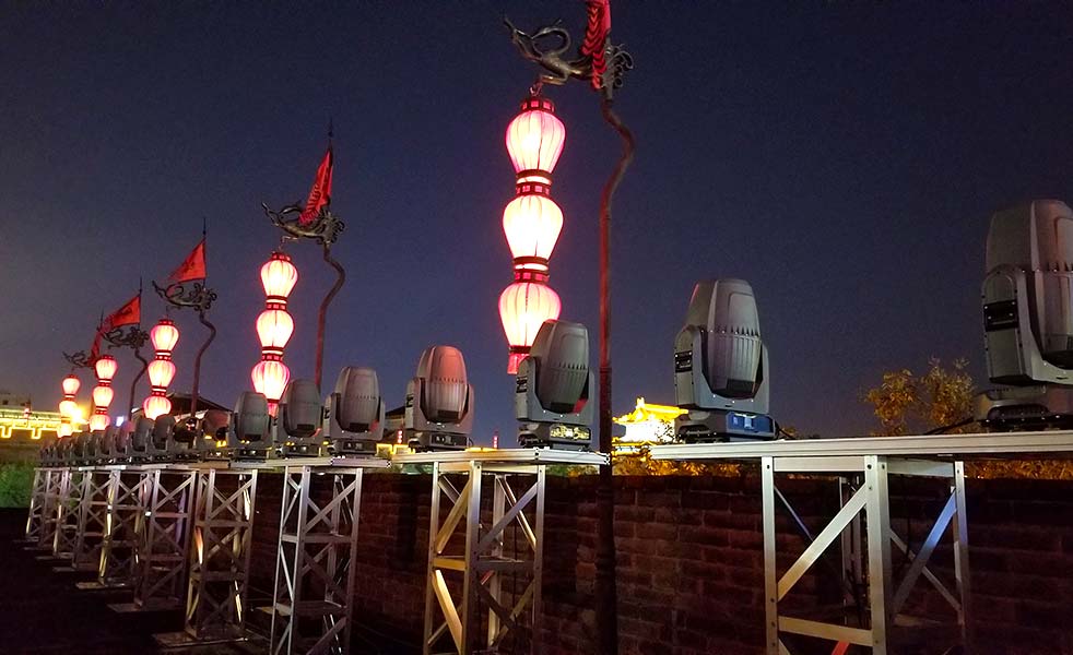 西南城角“嗨皮·陜博”光影秀,LAX AF110-P線陣列音箱搭配LAX AFL18B-P超低揚(yáng)聲器使用,數(shù)字音頻處理器是DSP36而功放機(jī)產(chǎn)品是MT1300。PS108全天候全頻音箱作為返聽揚(yáng)聲器,使用的是MPA4-500功放。
