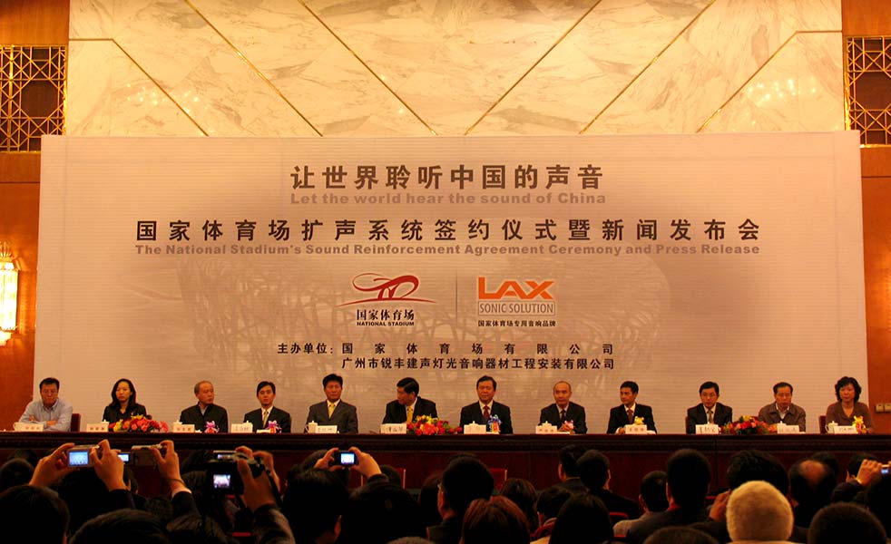 2006年12月8日,LAX以唯一一家中國品牌的身份擊敗國內(nèi)外競爭對手,簽約成為國家體育場“鳥巢”專用音響品牌,實現(xiàn)了奧運主場館采用中國音響零的突破。隨后更是拿下了近1/6的北京奧運比賽場館擴聲工程項目?!傍B巢”共使用236只雙十二寸全頻線陣列揚聲器,均勻覆蓋觀眾席與場地區(qū)域。