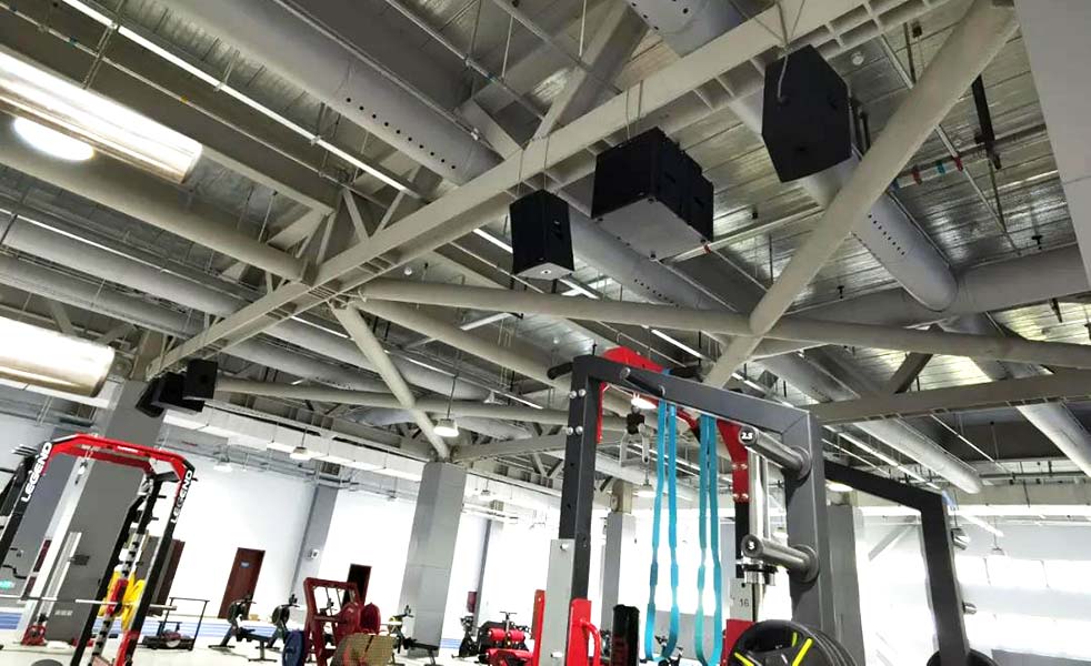 主擴音箱采用SR1562全頻音箱,吊裝在場地兩側(cè),根據(jù)健身房的實際長度調(diào)整每只音箱音域的輻射角度,確保覆蓋無死角,作為全場的主擴聲使用。