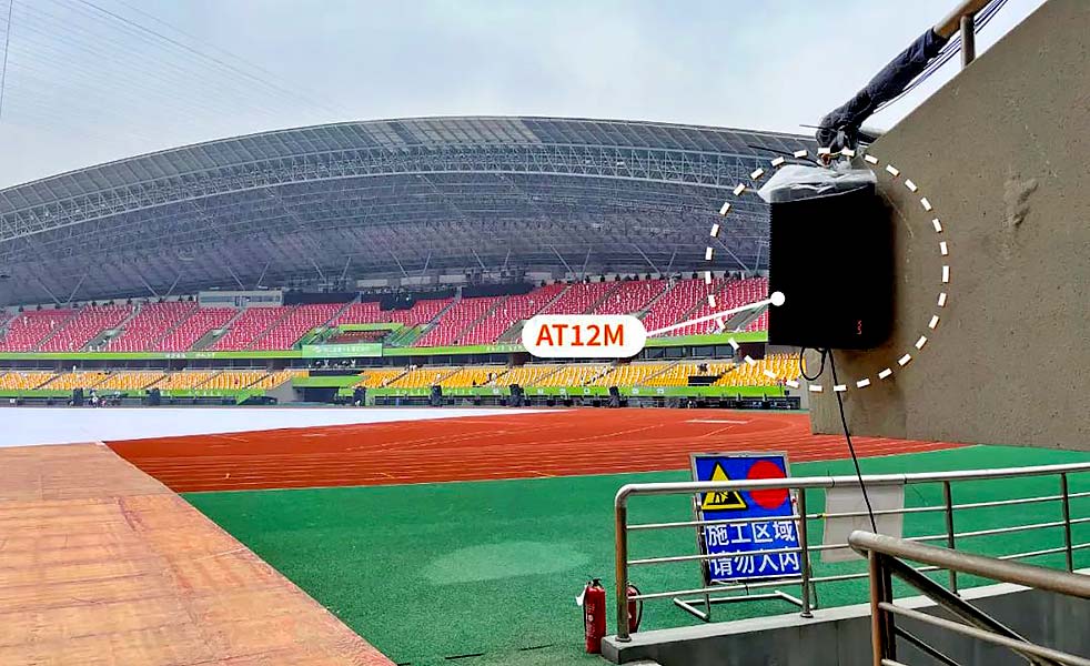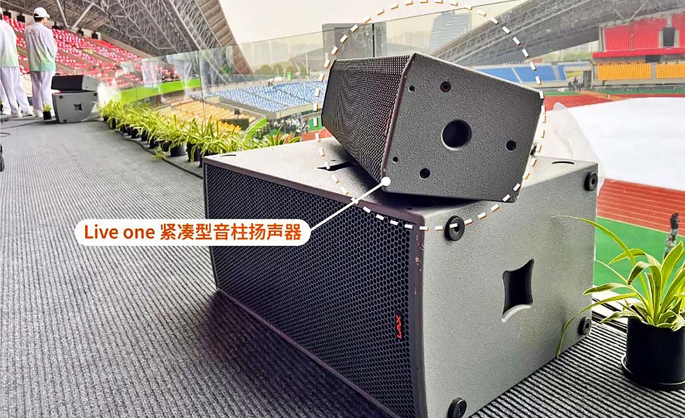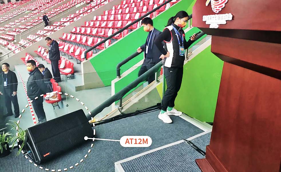 此外,為了讓主席臺位置有更好的觀看視角,場地方對主席臺做了專門的改造,在正前方增加了1米高左右的玻璃,原本主擴可以完全覆蓋主席臺,因為新增玻璃的遮擋,中高頻受到非常大的影響。因此迅速做出調(diào)整,在主席臺前方增加2組Liveone有源音柱,將全頻音柱水平放置在低音上,軸心對準(zhǔn)主席臺中間位置,地面?zhèn)妊a增加AT12M揚聲器,迅速解決了主席臺清晰度問題,同時完全沒有影響到主席臺的視覺效果。