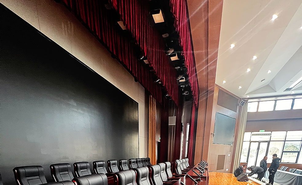 我司為本項目舞臺機械幕布系統(tǒng)配備:1道前檐幕、1道對開大幕、3道燈光吊桿、1道固定面光、2道橫側(cè)幕吊桿、1道景物吊桿、1道對開底幕,臺上電氣與控制系統(tǒng)。