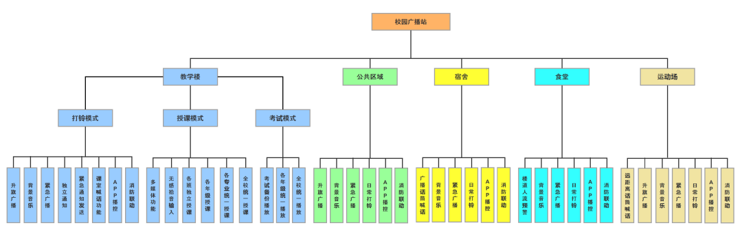 功能區(qū)域模塊化分區(qū)組合,自由編組,教室點對點廣播,預留應(yīng)急廣播系統(tǒng)。