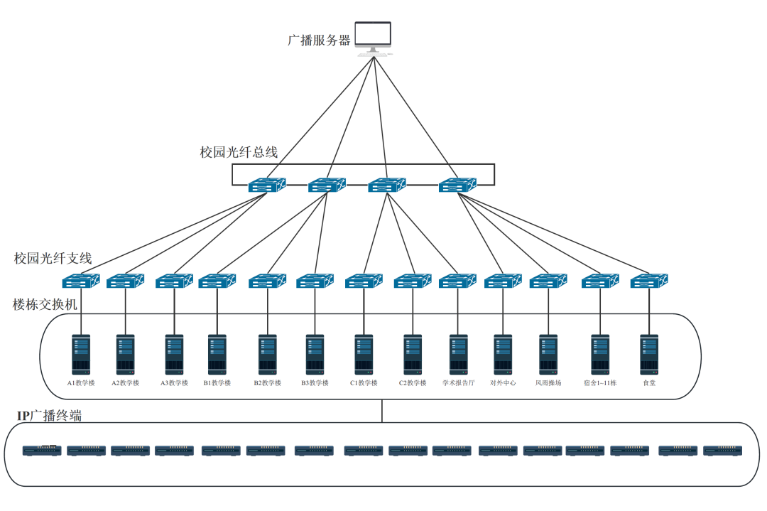 通過學校預埋光纖,每棟建筑的廣播網(wǎng)絡(luò)匯聚至行政綜合樓6樓。每棟建筑一樓使用2路光纖(一主一備),配置光口交換機,樓層網(wǎng)口較多的在樓層3樓做分層交換機,每間課室及實訓室獨立布網(wǎng)線至樓層弱電間,實現(xiàn)獨立的廣播網(wǎng)絡(luò)局域網(wǎng)。