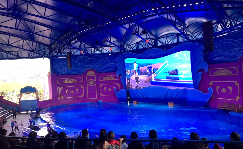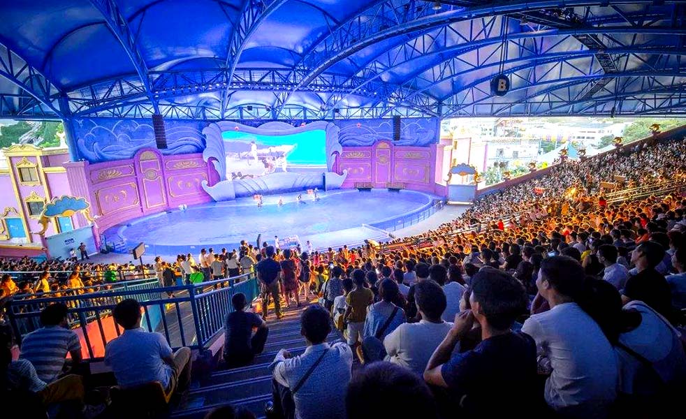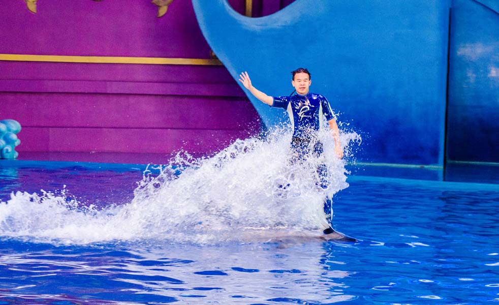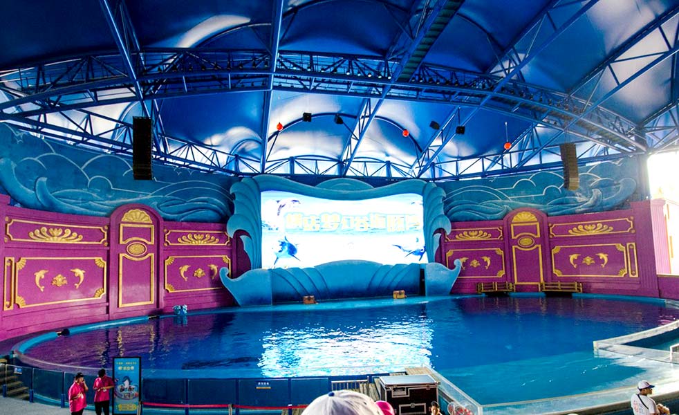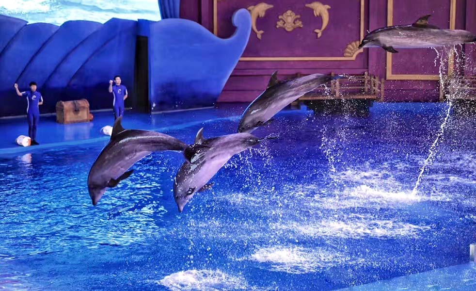 橫店夢幻海豚灣總面積24000平方米,游客可以在華麗的海豚宮殿里觀看海豚表演、參觀海豚養(yǎng)殖,還可以在五彩繽紛的海豚廣場欣賞各種趣味的海洋主題景觀。其中的海豚表演館作為整個(gè)區(qū)域的項(xiàng)目中心和視覺景觀焦點(diǎn),為游客呈現(xiàn)的是一座精美華麗的海豚宮殿,內(nèi)可同時(shí)容納3000多人觀看海豚表演。也就是說,橫店海豚灣絕對不是玩玩票, 不管從占地、表演場容納量,還是海豚數(shù)量,都當(dāng)之無愧是華東地區(qū)最大的海豚館。