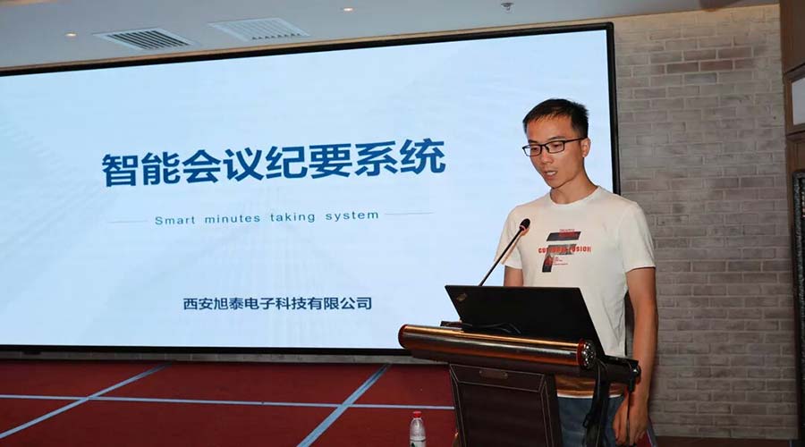 西安旭泰電子科技有限公司技術(shù)經(jīng)理李波講解了智能會(huì)議紀(jì)要系統(tǒng)在會(huì)議中的實(shí)用性,并在現(xiàn)場進(jìn)行了應(yīng)用演示。