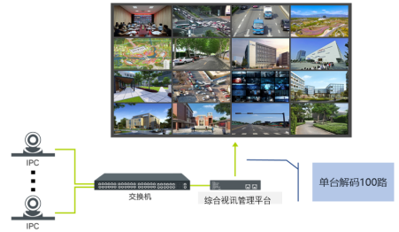 系統(tǒng)另外支持接入綜合視訊管理平臺(tái),該平臺(tái)支持GB28181,ONVIF協(xié)議,單臺(tái)設(shè)備支持100路IPC攝像頭信號(hào)同時(shí)上屏。