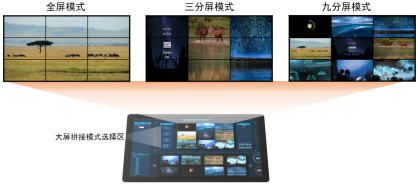 系統(tǒng)可自定義拼接大屏常用拼接模式并保存,隨時(shí)可一鍵調(diào)用該拼接模式,比如全屏模式和三分屏模式等。