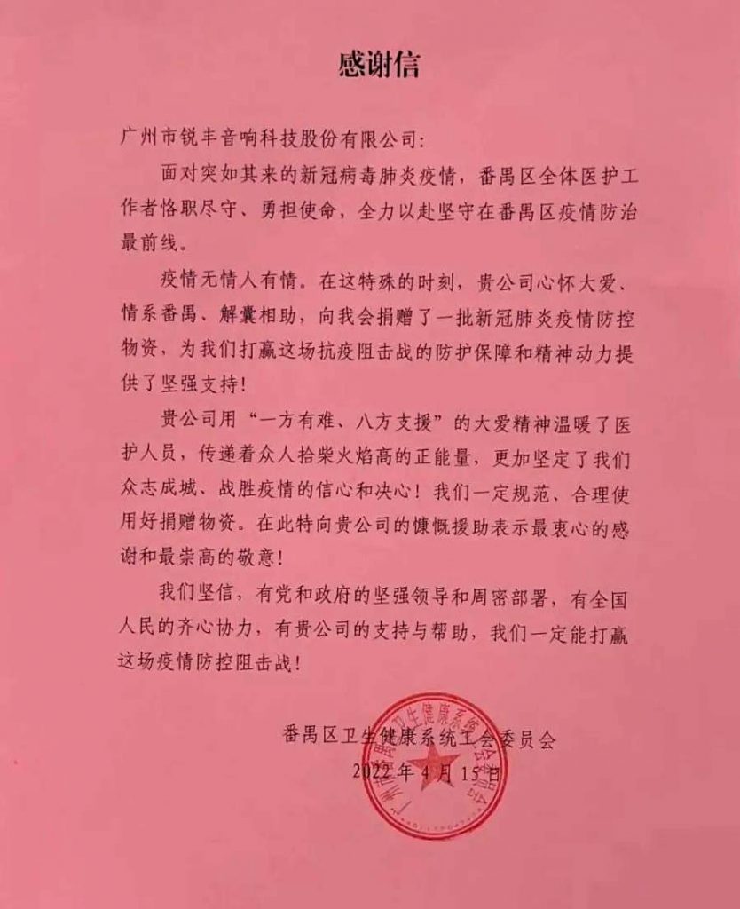 疫情爆發(fā)初期至今銳豐科技持續(xù)關(guān)注新型肺炎疫情動(dòng)態(tài)始終把社會(huì)責(zé)任放在前位多次向全國各地捐贈(zèng)音響設(shè)備共計(jì)3000+套幫助宣傳抗擊疫情的防控和注意事項(xiàng)共同抗擊疫情展現(xiàn)抗疫時(shí)期對(duì)廣大人民與奮戰(zhàn)在抗疫一線人員的支持!