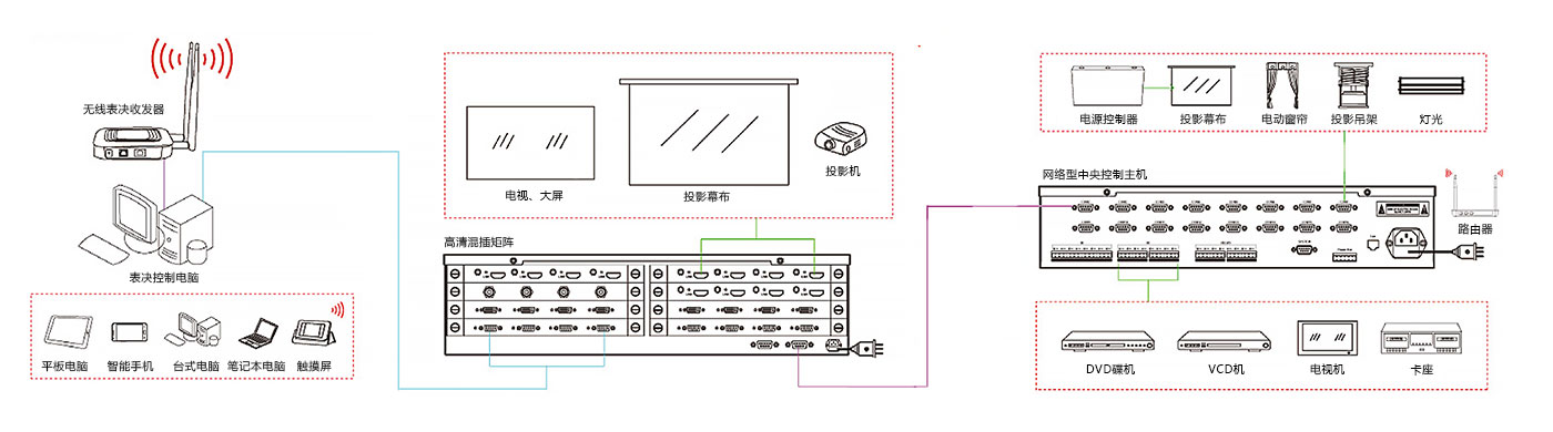 計(jì)算機(jī)系統(tǒng)包括臺(tái)式機(jī)、筆記本、服務(wù)器等,用于進(jìn)行教學(xué)、培訓(xùn)、演示以及控制。投影顯示系統(tǒng)由投影儀、視頻展示臺(tái)、投影屏幕等組成,完成展示靜態(tài)圖片或活動(dòng)視頻等圖文信息的大屏幕顯示。A/V系統(tǒng)完成視音頻信號(hào)的采集、播放和切換,主要包括攝像設(shè)備(如攝像機(jī)),顯示設(shè)備(如電視機(jī)、顯示器),傳聲設(shè)備(如有線話筒、無(wú)線話筒),擴(kuò)聲設(shè)備(如功放、音箱、調(diào)音臺(tái)),播放設(shè)備(如DVD、錄像機(jī)、卡座),信號(hào)切換設(shè)備(如視音頻矩陣)等。房間環(huán)境系統(tǒng)主要指房間的可調(diào)燈光和電動(dòng)窗簾等,完成對(duì)整個(gè)房間環(huán)境、氣氛的改變,以適應(yīng)當(dāng)前的需要。